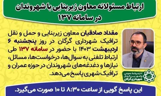 با چنین نگاهی مقداد صادقیان معاون زیربنایی و حمل و نقل ترافیک شهرداری گرگان در روز پنجشنبه ۶ اردیبهشت ۱۴۰۳ با حضور در سامانه ۱۳۷ طی ارتباط تلفنی به سوال ها، درخواست ها، مسائل، نیازها و دغدغه های شهروندان در حوزه عمران و ترافیک شهری پاسخ می دهد.