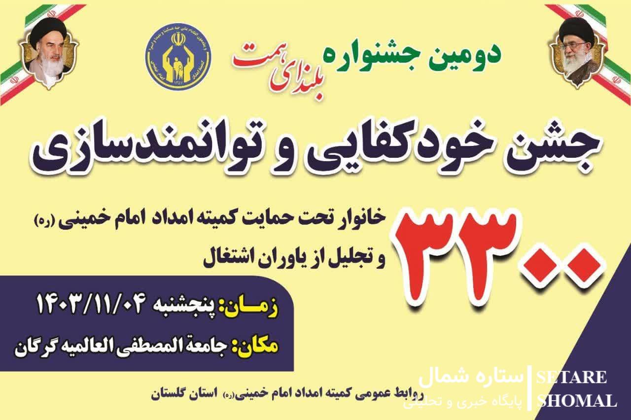 مدیرکل کمیته امداد گلستان از جشن توانمندی وخودکفایی ۳۳۰۰ مددجوی تحت حمایت کمیته امداد گلستان در تاریخ ۴ بهمن ماه سالجاری خبرداد.
